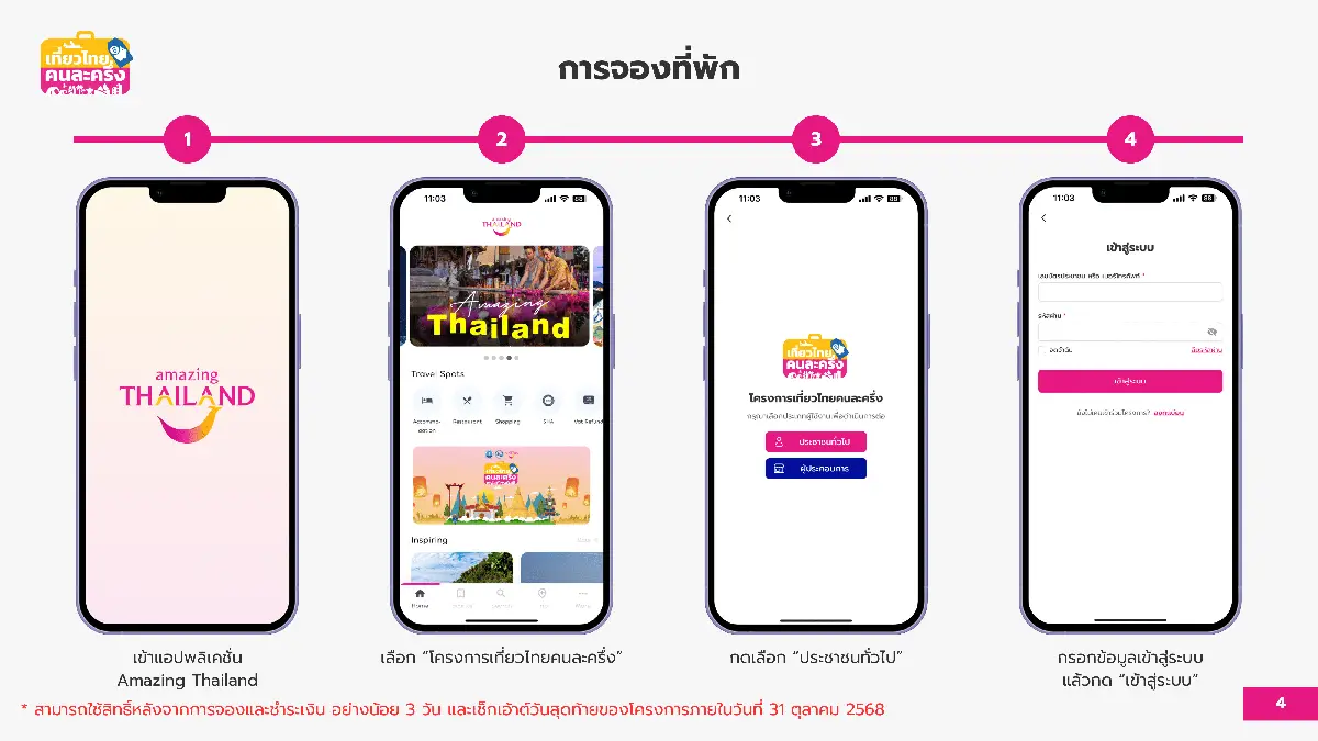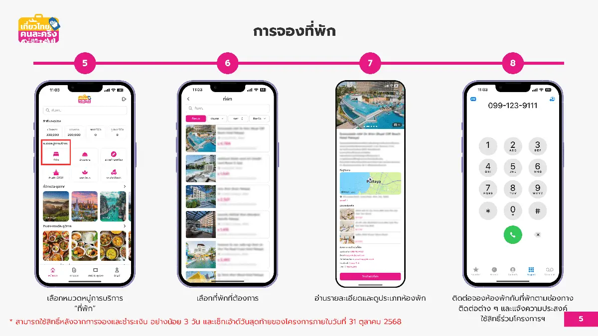เมื่อเข้าสู่แอปพลิเคชันแล้ว ให้เลือกหมวดหมู่ “ที่พัก” จากหน้าหลัก ระบบจะแสดงรายชื่อที่พักที่เข้าร่วมโครงการ โดยสามารถเรียกดูรายละเอียด รูปภาพ และสิทธิประโยชน์ที่จะได้รับจากการจองผ่านโครงการภายในหน้านี