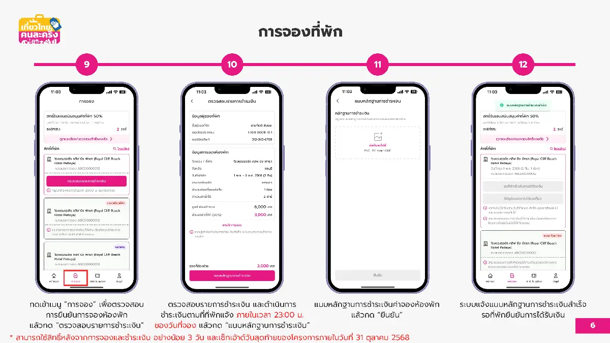 สามารถชำระเงินผ่านระบบ โดยได้รับสิทธิ์การสนับสนุนสูงสุด 3,000 บาท รวมถึงส่วนลดพิเศษจากโรงแรม ก่อนยืนยันการจอง ระบบจะแสดงรายละเอียดการจองและจำนวนเงินที่ต้องชำระเพื่อการตรวจสอบ