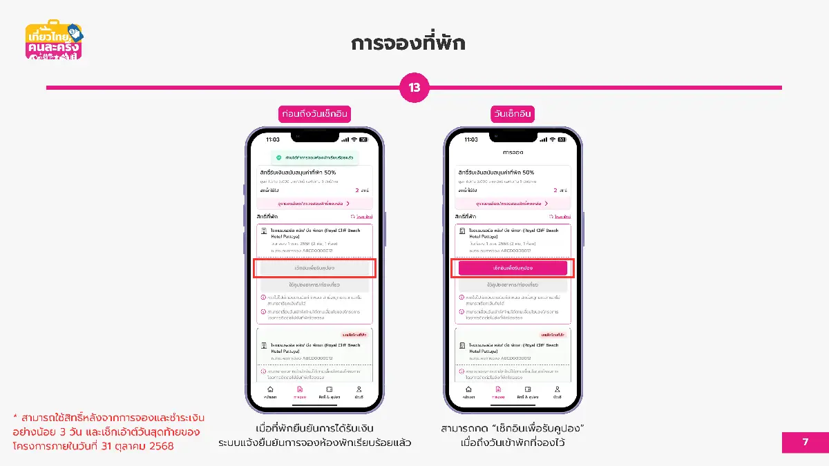 เมื่อที่พักยืนยันการได้รับเงิน ระบบจะทำการแจ้งยืนยันการจองห้องพักให้กับท่าน โดยปุ่มเช็กอินจะแสดงผลเป็นสีชมพู เพื่อให้ผู้ใช้ทราบว่าสามารถใช้สิทธิ์ในการเดินทางและเข้าพักได้ตามกำหนด